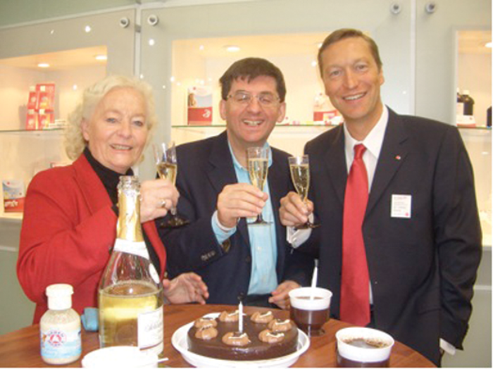 So, it is not surprising that Lawrence and I met in our early years. At every UHA exhibition, (now EUHA), Lawrence was always the first visitor to our booth as a customer and as friend. And we always welcomed him with German sausages called “Lange Kerls”, which he loved so much. My mother Inge used to send them to London frequently all those years ago, because he could not get them in England. The EUHA congress often coincided with Lawrence’s birthday and we surprised him with a birthday cake on our booth on several occasions.