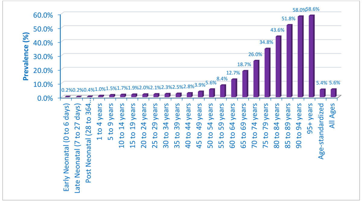 Moderate or higher level of hearing loss affects men and women in a relatively equal manner (217 million vs. 213 million, respectively) but differs significantly by age. Unadjusted estimates show that the global prevalence increases with age, rising from 12.7% at the age of 60 years to over 58% at 90 years (Figure 1). Approximately 60% of hearing loss is experienced by adults above the age of 60 years.