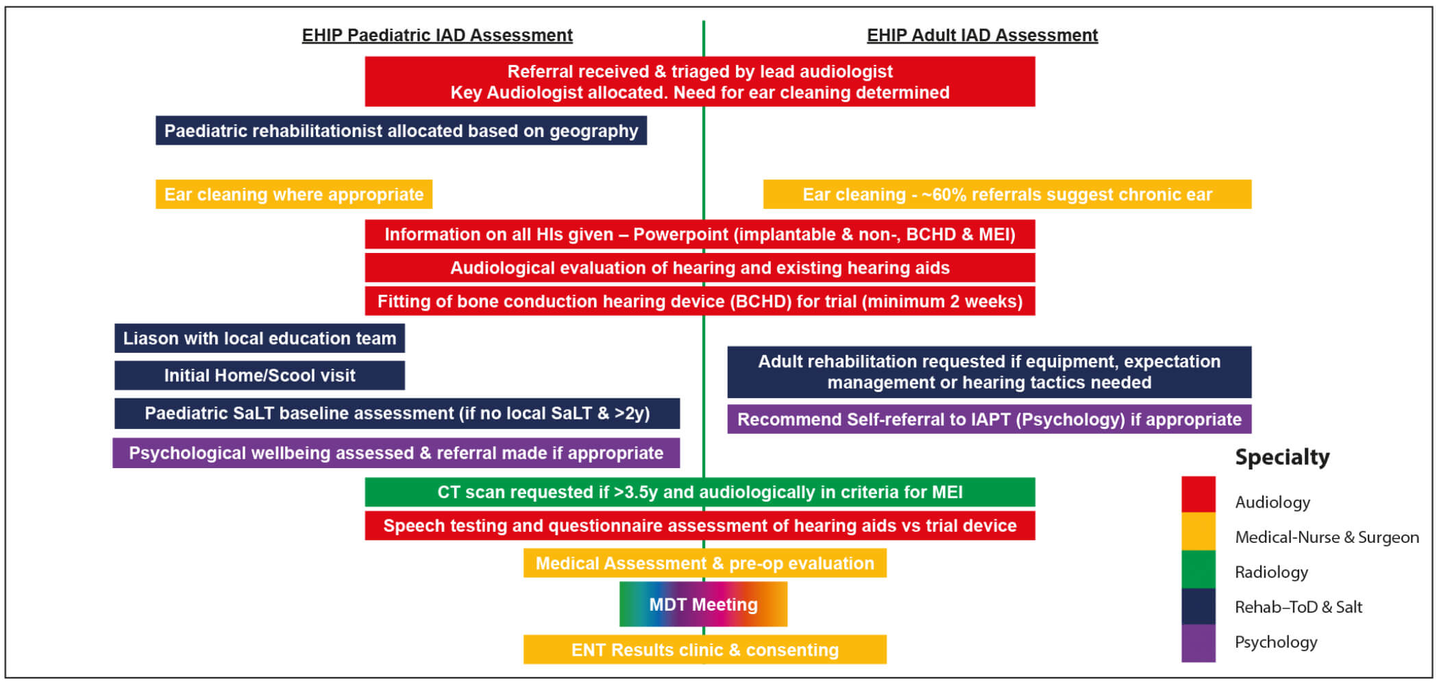 - Encouraging routine peer review - multiple professionals from the same speciality give robust review of each element of the MDT assessment (audiologists from different backgrounds reviewing each other’s work).