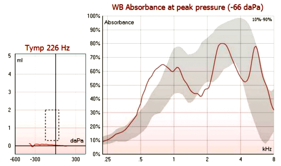 With WBT, clinicians are able to gain a deeper understanding of middle ear function using the absorbance graph. In a patient with normal middle ear function and a patent pressure equalisation tube, the absorbance graph is expected to remain relatively close to the age-related normative data, indicating normal middle ear function. If a patient displays a pathological middle ear beyond the PE tube, we expect to see this reflected in the absorbance graph which shows the middle ear transfer function. Figure 3 is an example of a patient with a patent PE tube. Notice how the absorbance fits within the normative data indicating normal middle ear function. It is important to note that the PE tube has a mass which can slightly affect the absorbance measurement, so results may appear just outside normal limits on some occasions.