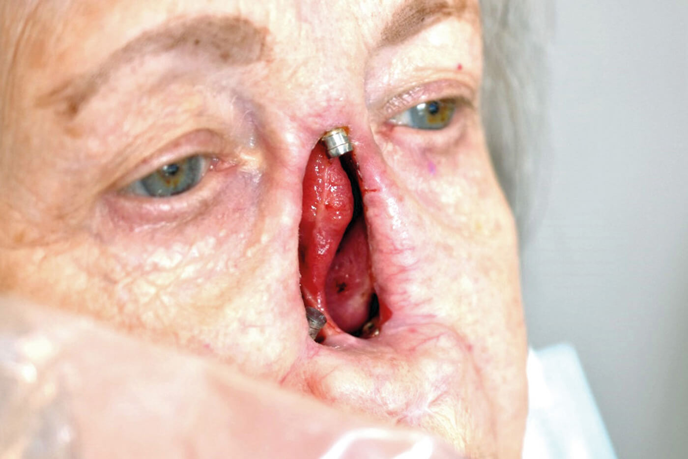 A good prosthetics team can do wonders. The options range from relatively small prosthetics, which might be glued on to cover smaller defects on the alar, sidewall, or tip of the nose, to larger ones that can form a new columella and support the remnants of the nose — up to a total nasal prosthesis, which can be retained with glue or implants.