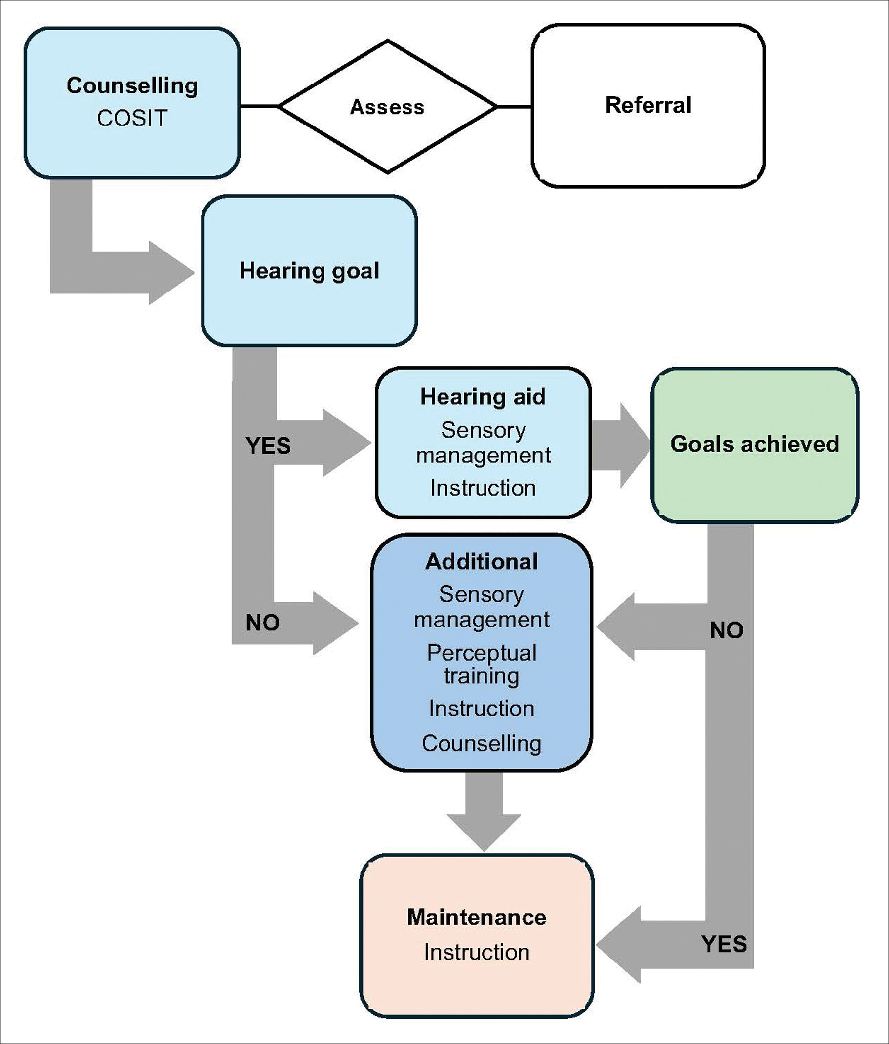 Our consultations begin with non-judgemental reflective listening as to how the patient is feeling and reasons for attending the clinic. This is followed with a conversation about what the patient wants from therapy. This is an opportunity to assess if the patient would benefit from referrals to other professionals. The Client Oriented Scale of Improvement in Tinnitus (COSIT) is then used to identify individual goals and therapy priorities that may include hearing [2]. The individual and clinician consider the degree of tinnitus problem and the best means to meet each therapy goal. We provide psychoeducation focused on selective sound perception and attention. Tinnitus is discussed as a self-relevant but unexplained event. The counselling empowers patients to take a proactive role in explaining their tinnitus and executing behaviours to attain goals [3].