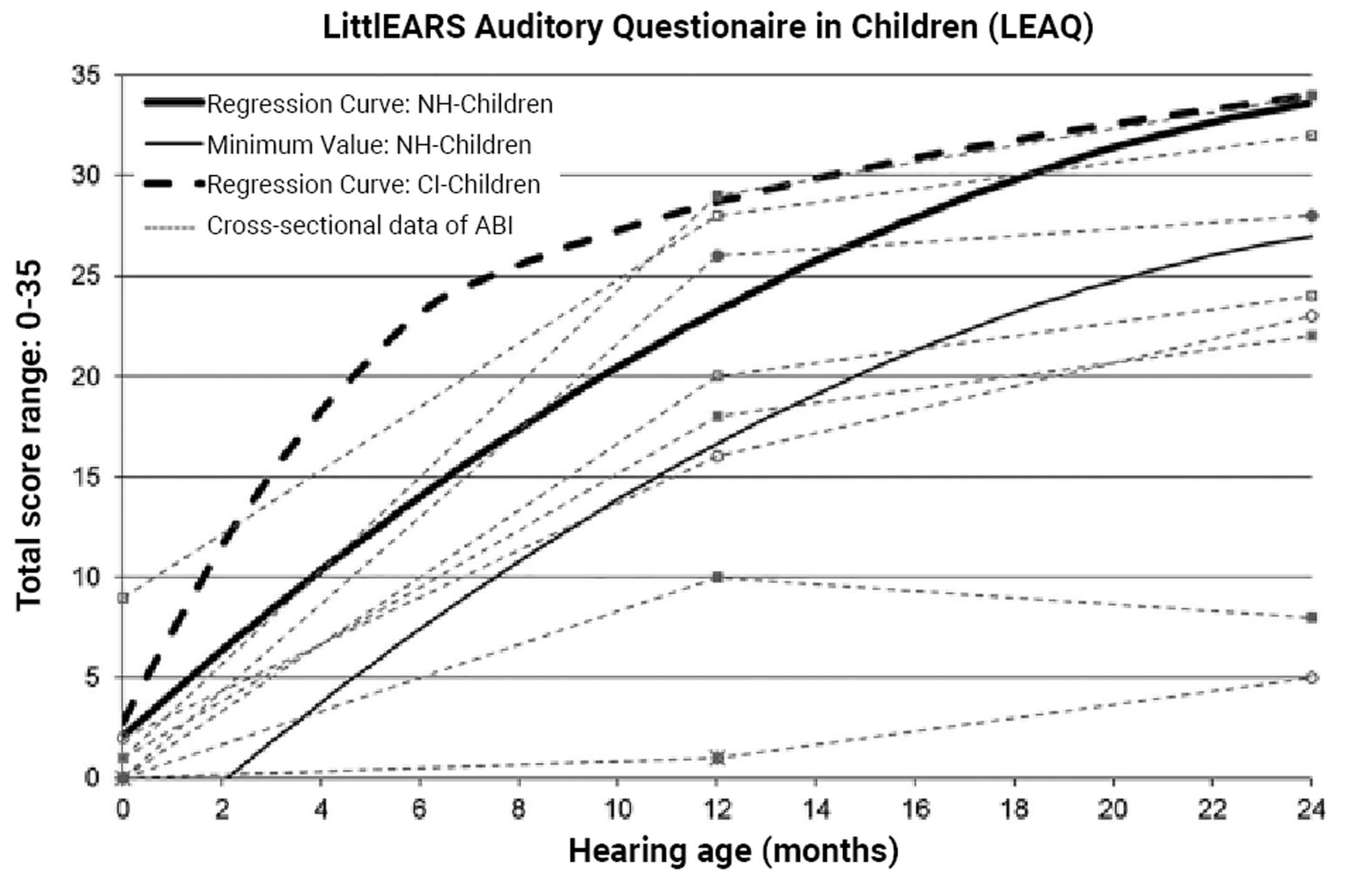 Figure 2. Gradient of LittlEARS Auditory Questionnaire in Children (LEAQ) scores of the nine children with an ABI compared to (1) the norm curve of the German-speaking normal-hearing (NH)-group (n = 218) and (2) the regression curve of children with a CI. Child #6 and Child #9 had overlapping values until hearing age of 12 months. At 24 months, data was available for Child #6 but not for Child #9 (who dropped out at 18 months).