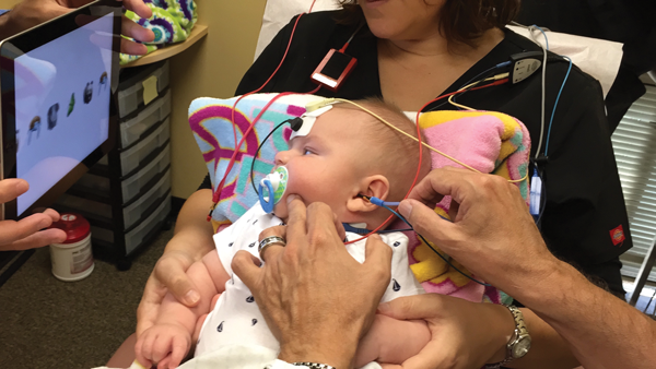 Figure 1: Testing a three month-old high-risk infant with c-VEMP at The American Institute of Balance.