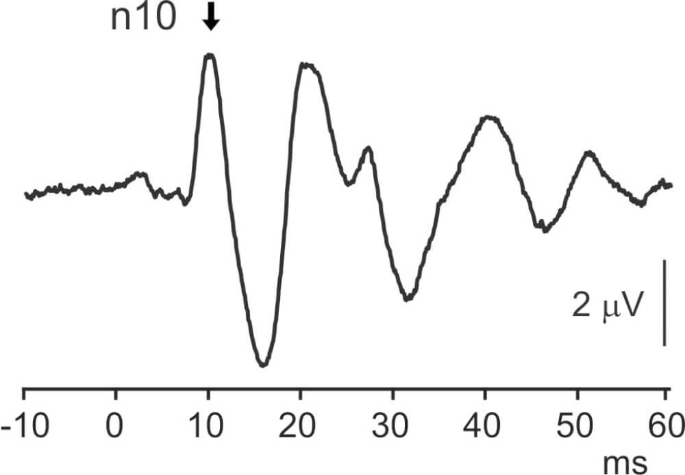 Figure 1b. The surface response consists of a series of waves, starting with a negative potential at 10 ms (n10).