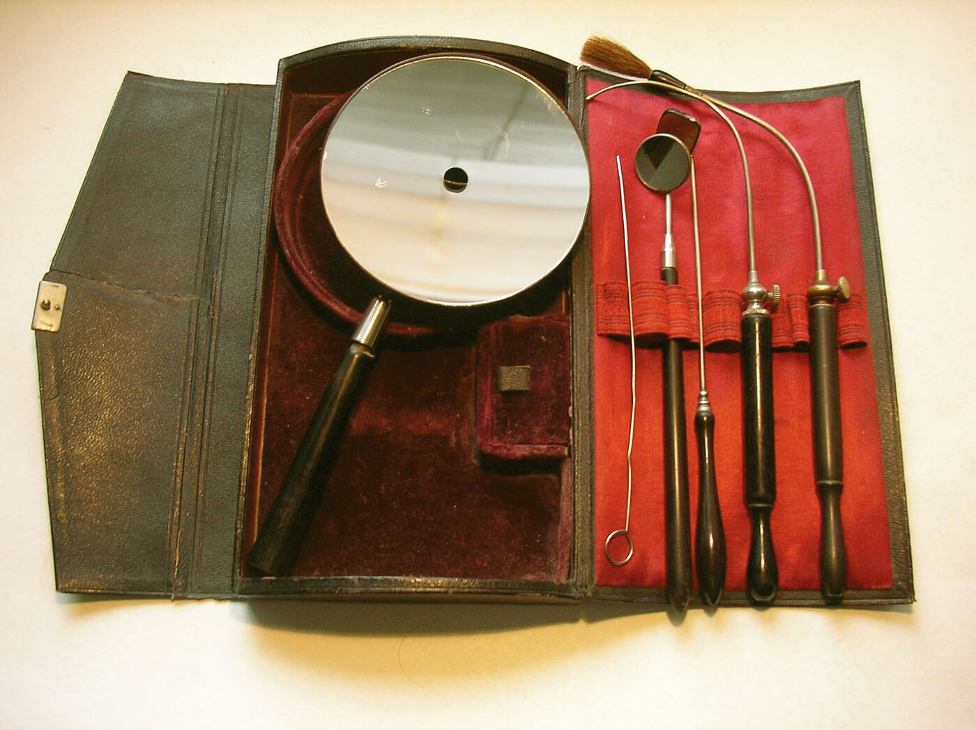 Around 1900 complete cased laryngology sets became available (Figure 2). In addition to the head mirror, they included a range of different sized laryngeal mirrors, a laryngeal probe and a brush attachment made from squirrel or camel hair for the contemporary practice of ‘throat brushing.’