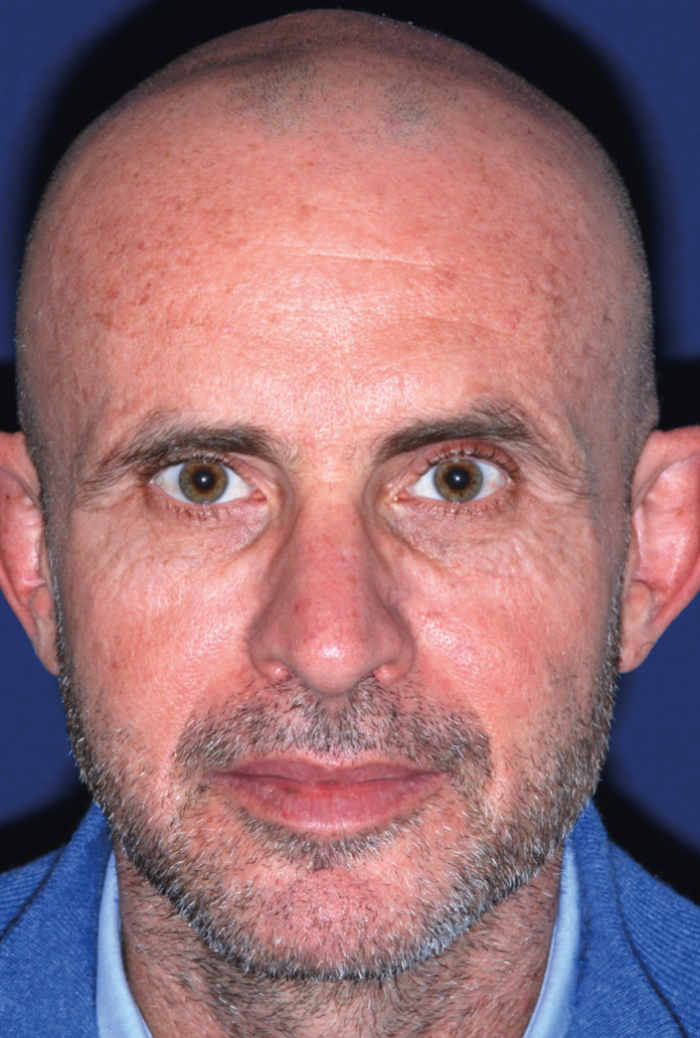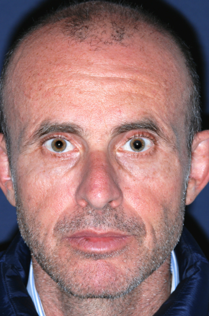 Frontal view. Preoperative (left) and postoperative (right) views after endonasal hybrid rhinoplasty in a patient with problematic skin. Selective defatting coupled with longitudinal shaving of the cartilaginous dorsum recreate more aesthetical ‘chiaroscuro’ lines without interrupting the continuity between septum and upper lateral cartilages. The brow-tip line flows more smoothly and elegantly despite the thick, porous, anelastic skin.