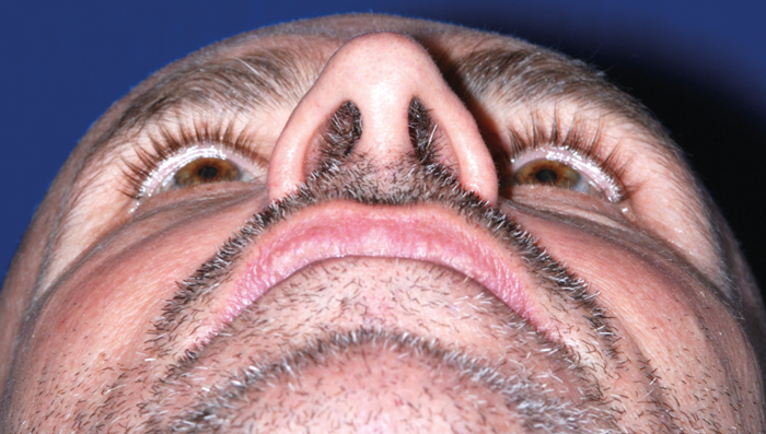 Base view. Preoperative (left) and postoperative (right) views. The preservation of the skeleton of the tip cartilage helps in keeping the structural integrity of the cartilaginous alar ring. The retropositioning of the septo-spinal complex allowed to recreate a more functional and aesthetical relationship between the infratip and the height of the nostrils.