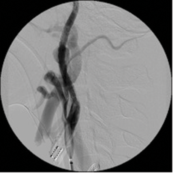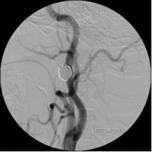 Endovascular treatment is now the gold standard for this condition. Three techniques can be employed by interventional neuroradiologists to treat ‘carotid blowout’. The first involves permanent balloon occlusion (PBO) of the carotid artery with a detachable balloon thus preventing blood flow into the bleeding vessel [12]. Prior to performing permanent balloon occlusion a ‘temporary balloon occlusion’ is performed with a non-detachable balloon in order to identify the patients at risk of cerebral ischaemia secondary to parent vessel occlusion. Such patients can also be treated by selective occlusion of the bleeding vessels, leaving the main carotid artery patent [14]. The third option involves placement of a ‘covered’ carotid stent [15-18], across the site of vessel blowout.