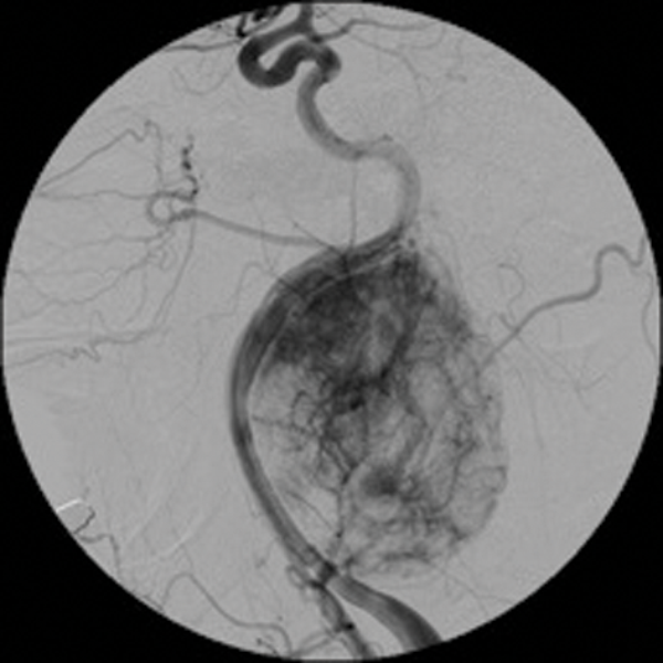 Embolisation is also effective in paragangliomas (glomus tympanicum, glomus jugulare and carotid body tumours). These are tumours arising from paraganglionic chemoreceptor cells which receive their blood supply from the ascending pharyngeal artery. They can be multicentric, locally invasive with malignant potential. Preoperative embolisation of paragangliomas greatly facilitates surgery and reduces the operative time and reduces the associated morbidity [3, 4]. (Figure 2 shows a case of preoperative embolisation of a glomus vagale tumour).