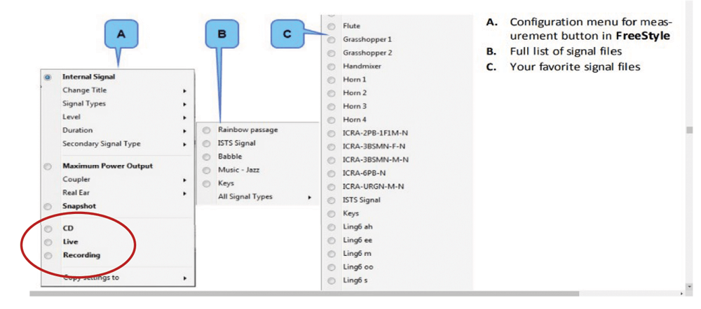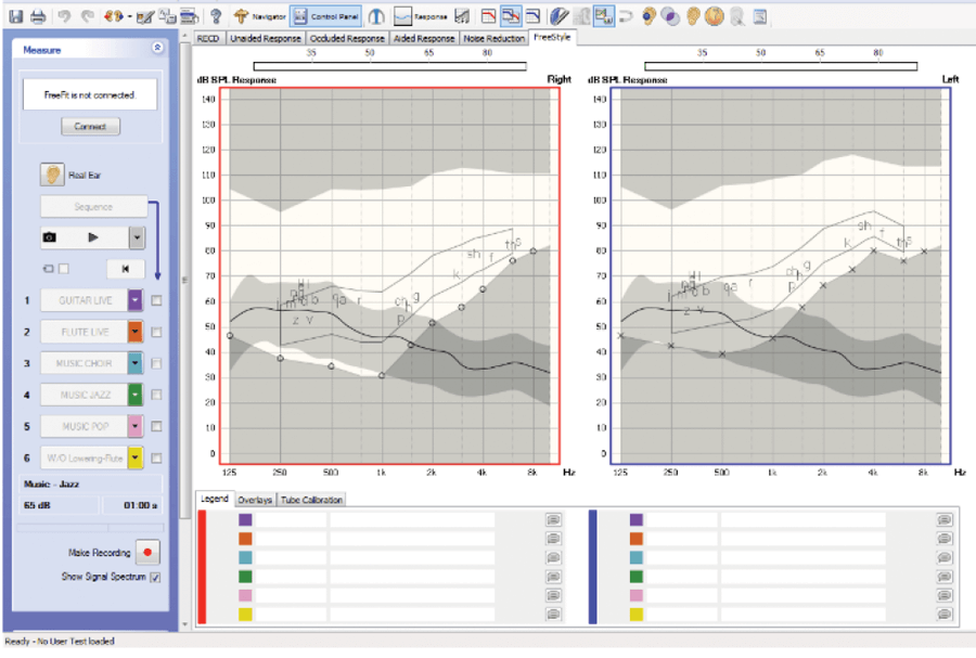 FreeStyle offers you a number of flexible features that allow you to create your own tests for demonstrating and verifying hearing instruments, features and fitting. FreeStyle enables you to make measurements using a variety of different sound sources. It allows for two signals to be played simultaneously, either from a front speaker and a rear speaker, or from a single speaker. Two measurements can be made which then allows for a view of a curve that illustrates the difference between the two measurements.