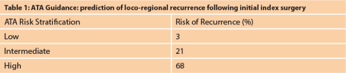 Risk stratification based on American Thyroid Association (ATA) guidance following initial index surgery is useful as a predictor of recurrence (see Table 1). This distinguishes it from the tumour, node, and metastases (TNM) staging system which more accurately predicts survival, with most deaths being attributable to stage III and IV disease. By definition, larger tumours with capsular breach and nodal metastases are independent risk factors of disease specific mortality, particularly in those patients over 45 years of age.