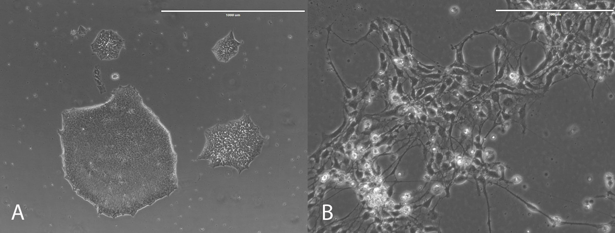 Figure 2: A) Image shows undifferentiated, human pluripotent stem cells in culture. B) Otic neuroprogenitors generated from human pluripotent stem cells by differentiating them using chemical signals that mimic human development.