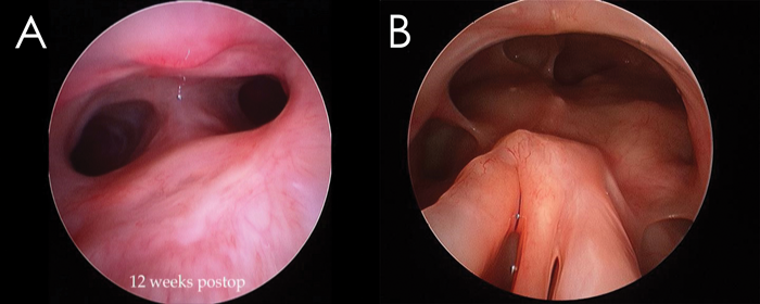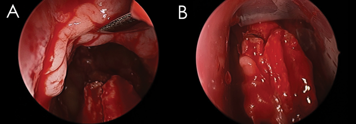 Figure 1. A narrowed and stenotic frontal opening that is not part of the remaining sinus system is considered suboptimal (A) compared to a common frontal sinusotomy that includes the frontal as part of the sphenoethmoidectomy, creating a neo-sinus cavity (B).