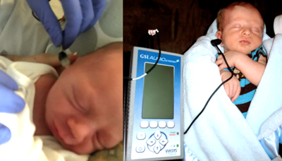 Figure 1. Newborn hearing screening with OAEs in a birthing centre (left) and at home following hospital discharge (right). Photograph (left) of William-James Finn McNeal at two days old courtesy of Victoria Hall-McNeal. Photograph (right) of Charlie Hall at two weeks old courtesy of Austin and Alessandra Hall.