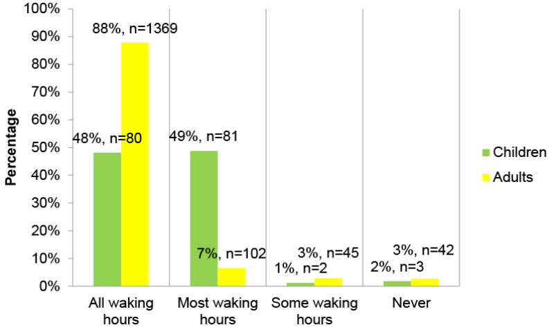 With regards to the BCHI users with bilateral hearing loss, clinicians have reported (n=1724) 10% (n=166) are children and 90% (n=1558) adults fitted with a BCHI. Figure 2 illustrates the current amount of usage of their BCHI.