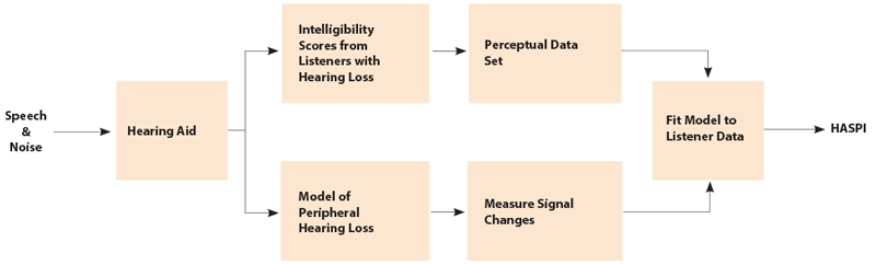 We have developed metrics both for speech intelligibility, the Hearing Aid Speech Perception Index (HASPI) [1], and for sound quality, the Hearing Aid Speech Quality Index (HASQI) [2]. Both of these metrics are based on measuring changes in the signal at the output of a model of the auditory periphery, and then developing mathematical models that match the measured signal changes to the listeners’ intelligibility scores or quality ratings. This approach is illustrated in Figure 2 for HASPI. Listeners are asked to identify words in a set of sentences where the speech has been degraded by noise and by the distortion produced by the hearing-aid processing. The intelligibility scores form a perceptual data set indicating how the different forms and amounts of degradation affect speech intelligibility. Each of the degraded sentences is also passed through a model of the impaired auditory periphery to produce auditory signals for each combination of processing condition and hearing loss.