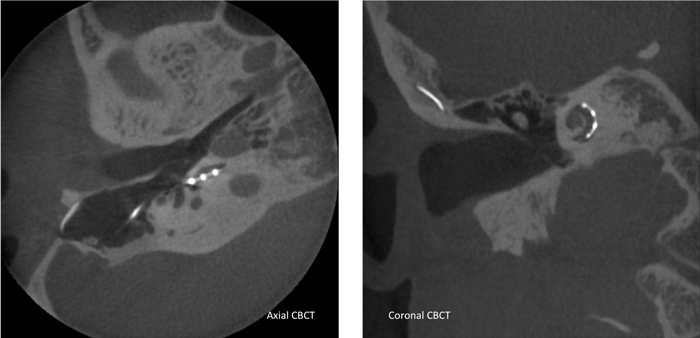 Figure 1. Left: Axial cone beam CT confirming that the array is in the scala tympani in the section shown. Right: Coronal cone beam CT showing the electrode array coursing around the lateral scalar wall.