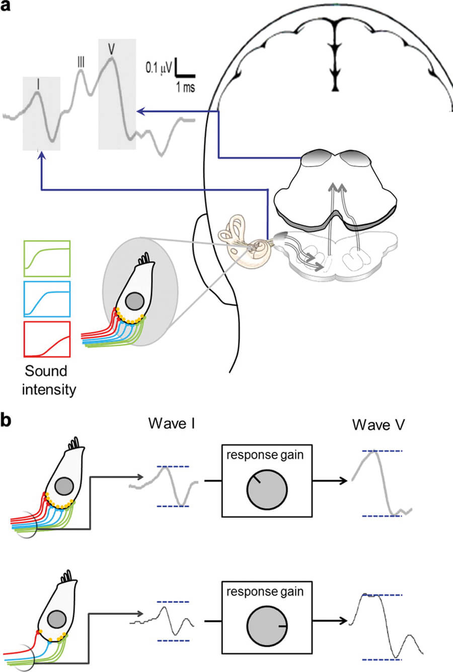 Figure 2. The auditory brainstem response (ABR) as an indicator of central gain. Waves I and V of the ABR localise to the auditory nerve and midbrain respectively (a). The ratio of these two indicates the amount of central gain taking place (b). Image reproduced with permission from Schaette and McAlpine [4].