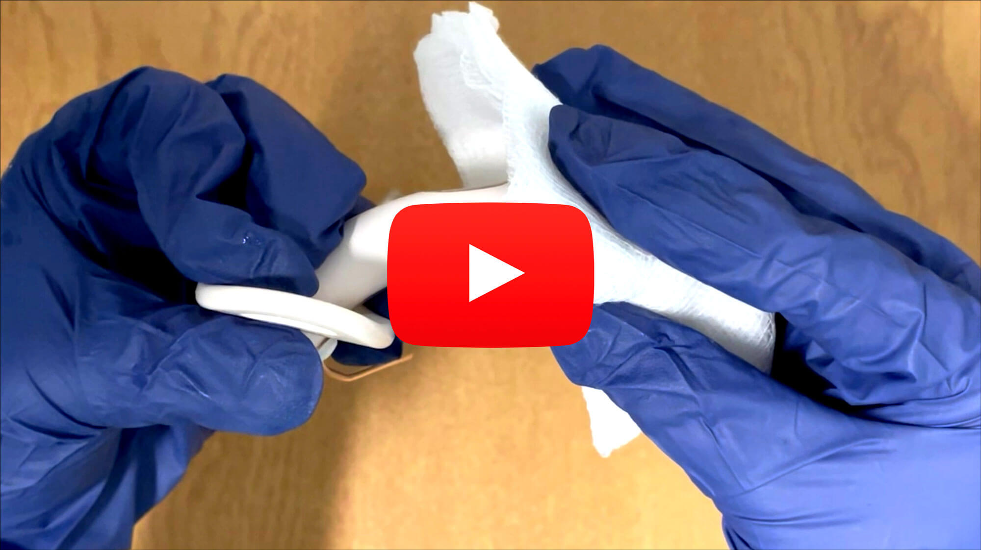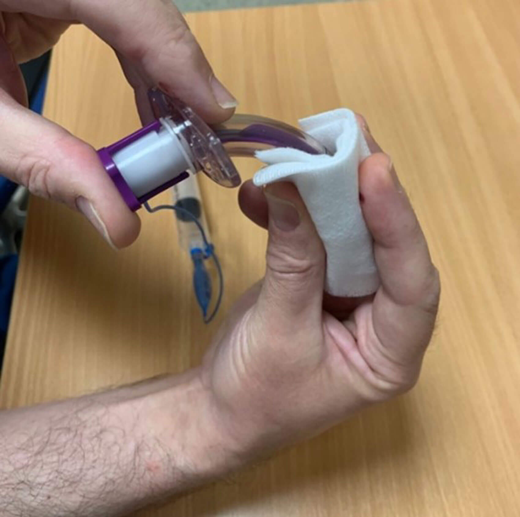 - A damp gauze swab is used to wrap around the inflated cuff of the tracheostomy tube in between the index, middle, ring fingers, and thumb of the dominant hand (Figure 2).