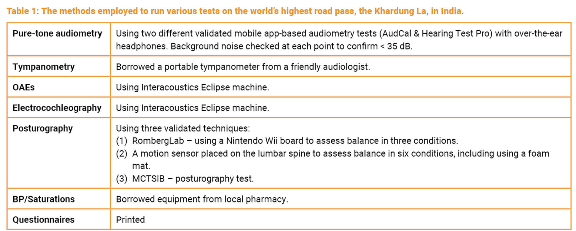 The actual process of making it a reality was a stormy one. We aimed to recruit eight healthy volunteers that were already travelling to an area of altitude. I would join this tour and look to recruit them into the study. An ethical requirement was for them to be UK residents. After toying with the idea of going back to the Everest Region, Kilimanjaro or South America, I eventually decided to go to Ladakh in Northern India - the location of the world’s highest road pass, the Khardung La, at 5350m. This is a common place for tourists, and the road access means carrying equipment is simpler. Sourcing equipment was the next challenge. I needed to find a way of doing pure-tone audiometry, tympanometry, otoacoustic emission testing, electrocochleography and posturography in an extreme setting. Table 1 shows the methods I eventually used to produce these results.