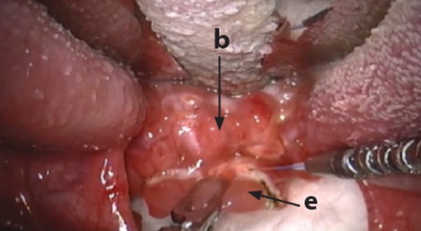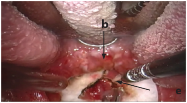 Figure 2: Tongue base reduction and epiglottoplasty (e = epiglottis, b = base ot tongue).