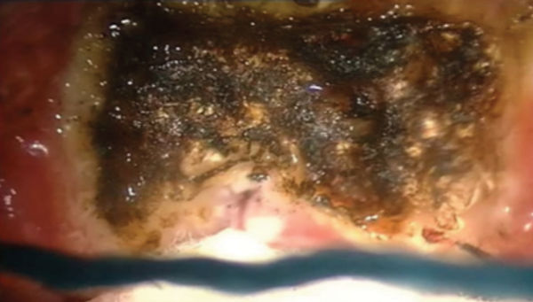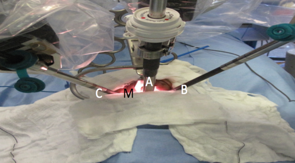 B = 273µm thulium laser; C = 5mm long tip Maryland dissector; M = patient’s mouth.