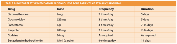 Mean set up time is 19.5±10.5 min and mean operative time for BOT reduction is 26.5±9.2 min and for epiglottoplasty is 10.4±4.9 min [6]. The average amount of removed tissue from the BOT is 10.3±4.1ml. Blood loss is minimal and patients receive perioperative and postoperative steroids to minimise lingual edema, nausea and pain. In addition, antibiotics and analgesics are given postoperatively (Table 1). Soft oral diet is allowed a few hours after surgery for most patients, although some centres use a nasogastric tube for all patients in the immediate postoperative period. The average hospital length of stay is 3.5±3.2 days with a wide range (1-19 days), reflecting the different hospital policies in different centres. In our unit, the first two patients stayed hospitalised for 48 hours as a matter of precaution but the remaining cohort (19/21 patients, 90.5%) were all discharged within 24 hours. The disposable costs for TORS are estimated to be approximately £1000 a case.