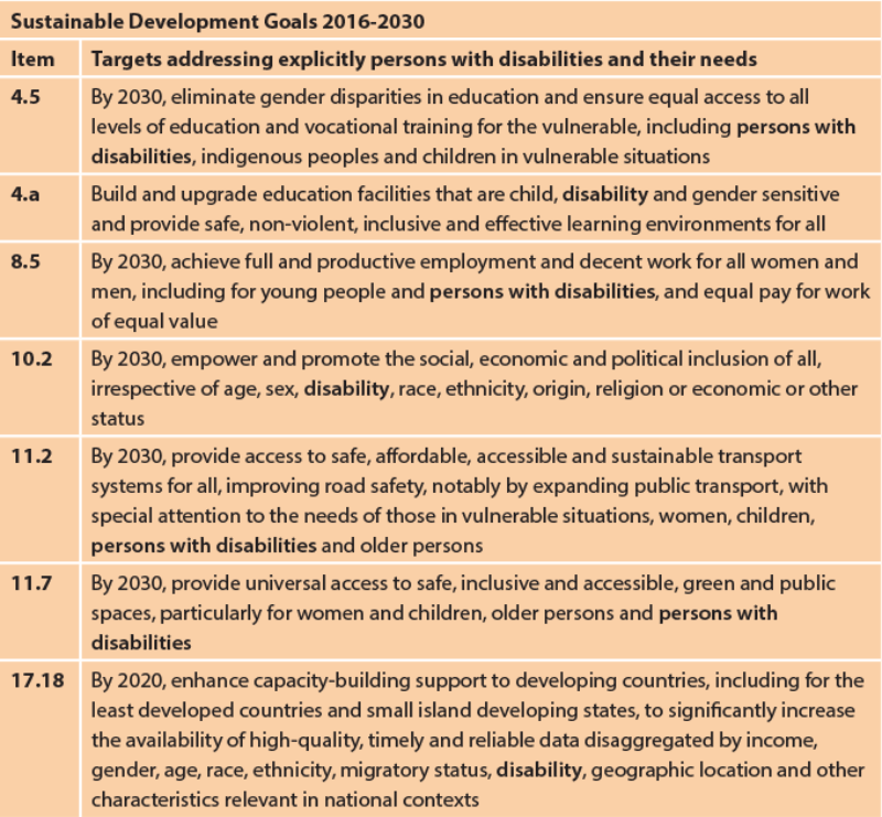 Seven of the targets specifically mention persons with disabilities (education, accessible schools, employment, accessible public spaces and transport, empowerment, inclusion and data disaggregation - see Figure 1). It is unlikely that any public health programmes in developing countries will receive significant international support outside the SDG framework. The challenge then, is how to demonstrate the relevance and benefits of UNHS within the prevailing global health context.