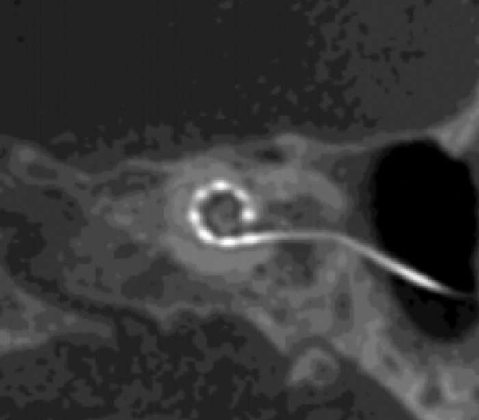Figure 1. Computed tomography image of a cochlear implant array of electrodes in-situ.