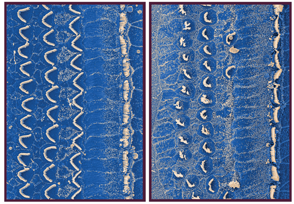 Figure 3. Normal and kanamycin damaged cochlear hair cells in a guinea pig, magnified about 2000X.