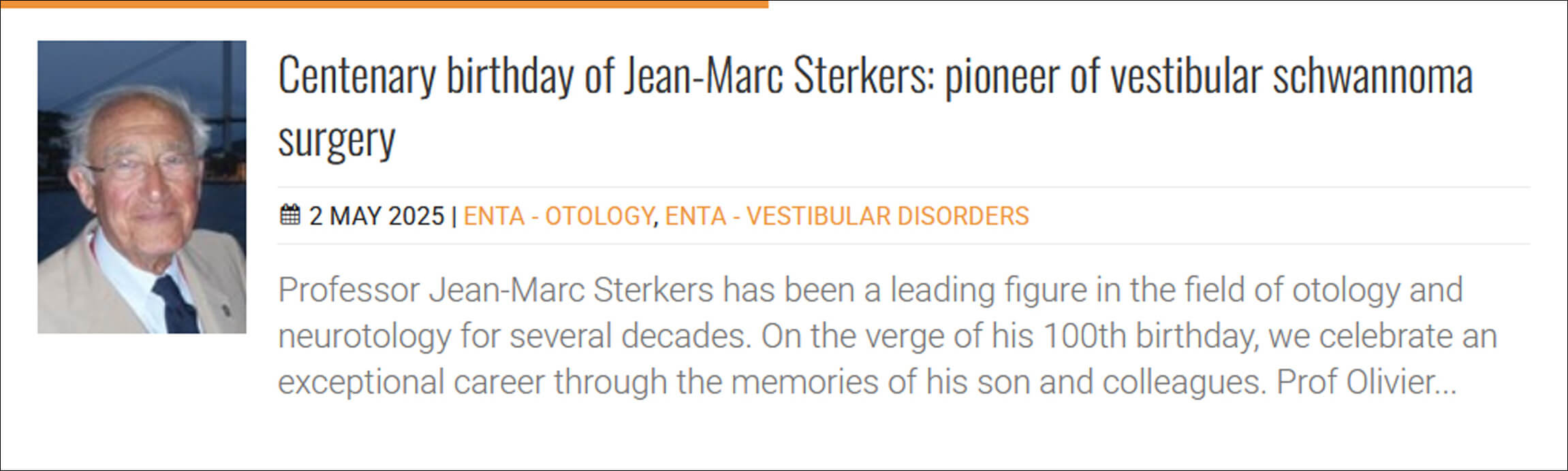 For May/Jun 2025, we look both forward and back. We celebrate the 100th birthday of Jean-Marc Sterkers, a pioneer of vestibular schwannoma surgery. His son has brought together a selection of contributions from Prof Sterker’s colleagues to commemorate the occasion.