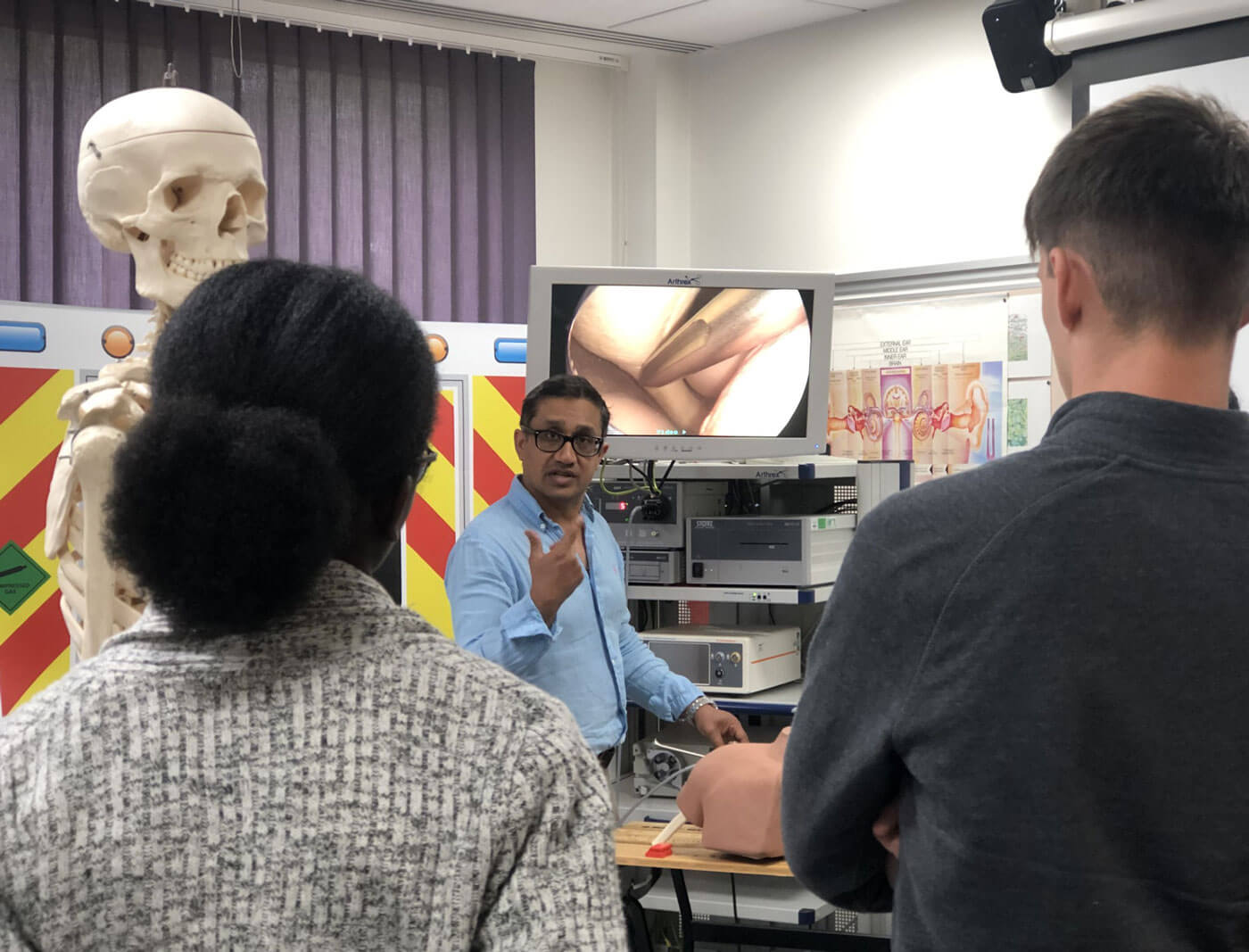Each event involves the children circulating from one hands-on interactive station to another. One station might teach them how to make a 999 call and perform CPR, another led by Dipalee Durve from the Evelina London Children’s Hospital translates the physics that they are taught at school with real life radiology (how often did we ask ourselves why we needed to know something at school?). The respiratory station is led by Miss Audrey Najuko, who takes great delight in passing the flexible nasolaryngoscope in me, so the children can see my nasal cavity and larynx. The highlight of the day is most probably the simulated accident and emergency station where children spend a few minutes taking a history from a ‘patient’ to come to a diagnosis (we felt it was important that children realise communication skills are vital in what we do). The station is led by Miss Katherine Steele, who not only takes the students through the different emergencies (a diabetic hypoglycaemic episode, asthma attack, stroke and heart attack) but also their treatment. With the skills the children learn on the day we hope they would be able to help someone in distress and call for appropriate help.